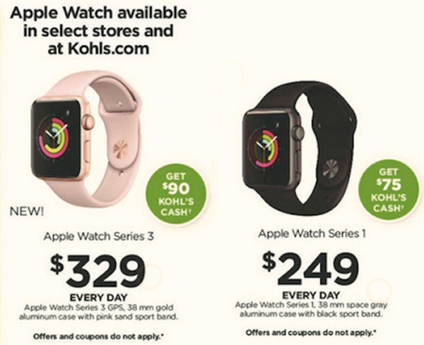 Kohl’s is offering Kohl’s Cash with the purchase of the Apple Watch, with the Cash able to be used for a future purchase.