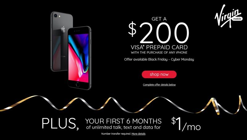 Customers who join Virgin Mobile between 12:00 a.m. on Thursday, November 24 through 11:59 p.m. on November 27 will get a $200 Visa prepaid gift card plus dix months of wireless service for $6.